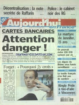 Read AUJOURD'HUI EN FRANCE [No 453] du 28/11/2002 - DECENTRALISATION - LA NOTE SECRETE DE RAFFARIN - POLICE - LE CABINET NOIR DES RG - CARTES BANCAIRES - ATTENTION DANGER - TOURS - LE MARTYRE DE JENNIFER - 15 ANS - ALIMENTATION - ON POURRAIT EVITER 100 000 CARCERS PAR AN - INONDATIONS - LES DIGUES DU RHONE SOUS HAUTE SURVEILLANCE - CRISE - LE TEXTILE FRANCAIS N'EN FINIT PAS DE SOMBRER - LES SPORTS - FORGET PDF